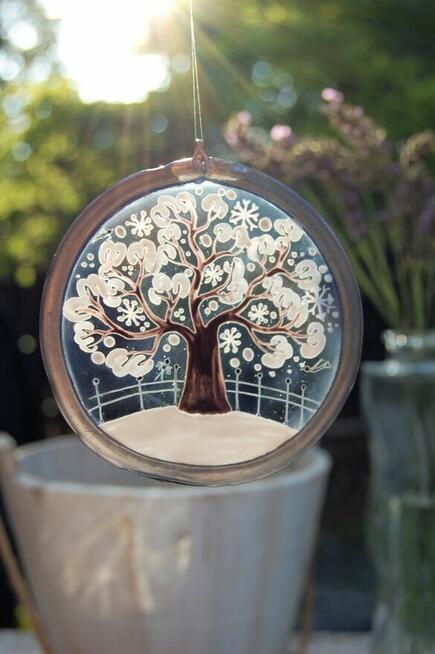 Stary, uroczy witrażyk z ośnieżonym drzewem, Szwajcaria. Witraż jest okrągły, szklany w metalowej oprawie z uchwytem u ...