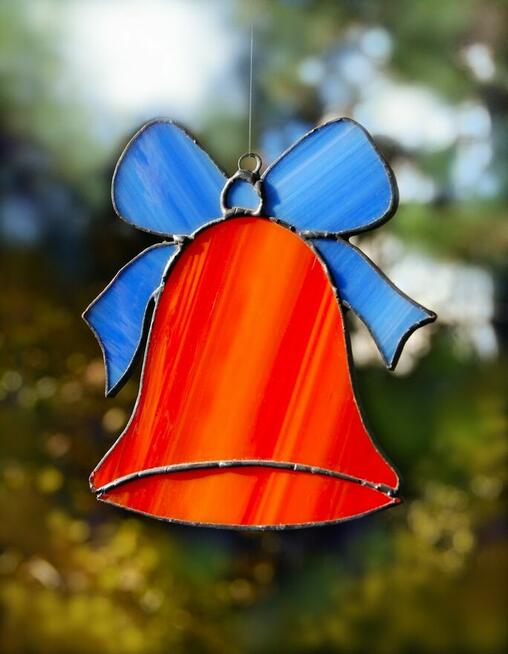 Świąteczny dzwonek z kokardą - witraż w technice Tiffany'ego. Witraż jest wykonany z półprzezroczystego szkła ...