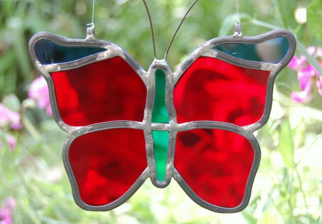 Piękny motyl - witraż w technice tiffany, który ożywi wnętrze czerwoną, intensywną barwą skrzydeł, kontrastującą ...