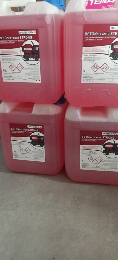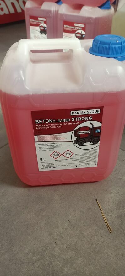 B. Silny Koncentrat Preparat do Zmywania zaschnietego Betonu o pojemności . 5 L za 59 zł netto Produkt jest dostępny w innych pojemność. : 10 L , 25L lub beczka 200 L . Na zamówienie.- Kwasny preparat do zmywania i usuwania zaschnietego betonu i zabrudzen po cemencie i osadów wapiennych . Zbudowany w oparciu o kwas fluowodorowy i siarkowy .
